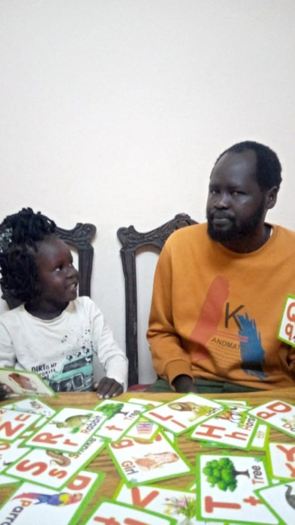 What inspired me to create Junub Kids is actually a very personal and emotional story. In 2020 my wife was diagnosed with kidney failure, and in 2021 we travelled to Egypt for her treatment. While there, we struggled to enrol our 5-year-old daughter in school due to the high costs of my wife’s treatment. That’s why my wife suggested I put my experience as a teacher to use by homeschooling our daughter, and so I did. I started searching for suitable English books, but I discovered that while South Sudan has a curriculum for pre-primary, there were no books developed. So I began writing my own books based on the national curriculum. Over 2.5 years I wrote tirelessly, often working days and nights, and finished 15 books. I then decided to take the book to the Ministry of General Education and Instruction. They formed a committee to review the books and were very happy with my work, so they approved it.